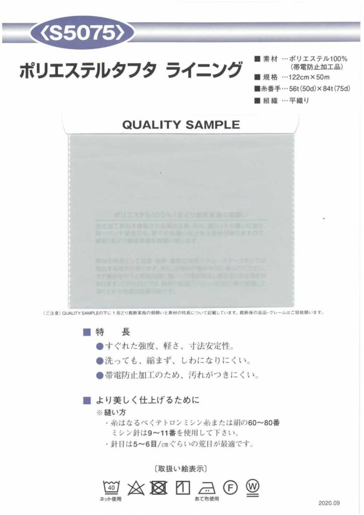 S5075 裏地は、タフタ裏地になります。主にポリエステルやナイロン、絹などで織られています。S5075 裏地はポリエステル素材になります。軽くて丈夫なうえにシワにもなりにくいためとても手入れが簡単ですよ!また、静電気防止加工が施されているのでこれからの季節にピッタリです。